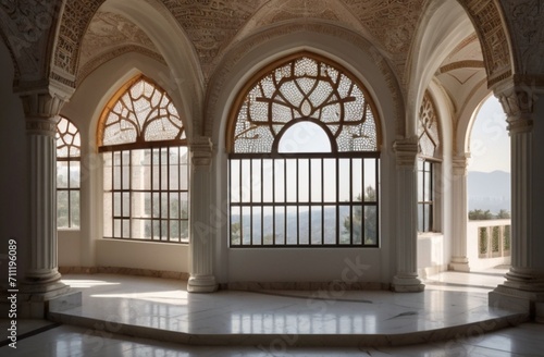 Fototapeta premium A ornamented arched vault on white marble, latticed window, view from Generative AI