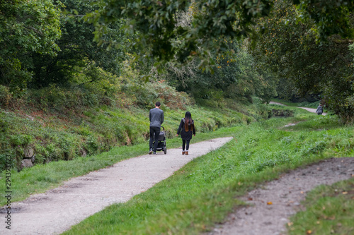 Obraz premium A oung couple with a child walking along a riverside footpath in Cornwall