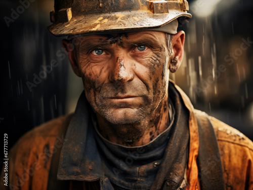 Fototapeta premium A Outlandish Energy Man in Worker Safety Uniform with Dirty Dust, Mud, Sweat on Face