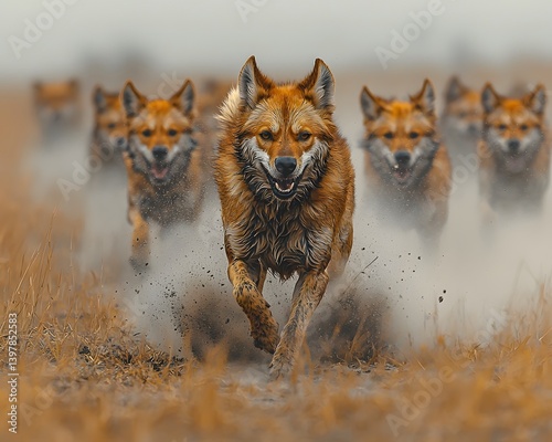 © Bussakon, Fototapeta premium A pack of foxes hunting together across the savanna stirring up dust as they move