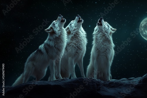 © Thammarong, Naklejka premium A pack of wolves howling at a full moon, their breath visible in the cold night air