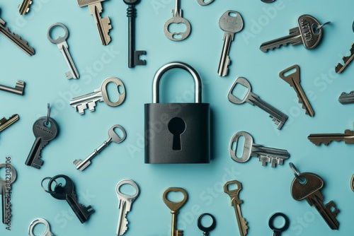 Naklejka premium A padlock surrounded by keys on a blue background