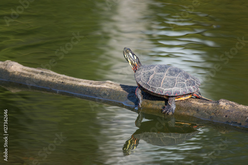 Obraz premium A painted turtle gets some sun on a log in fall in New England