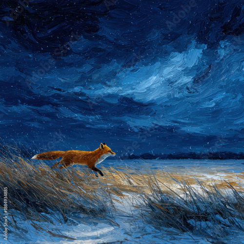 Fototapeta premium A painterly illustration depicting a fox running across a winter coastal...