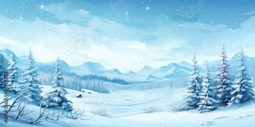 Fototapeta premium A painting depicting a serene snowy landscape with tall trees. This picture...