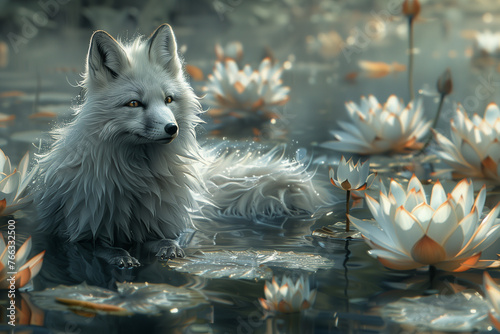 © alenagurenchuk, Fototapeta premium A painting featuring a white fox surrounded by water lilies in a pond, travel concept.