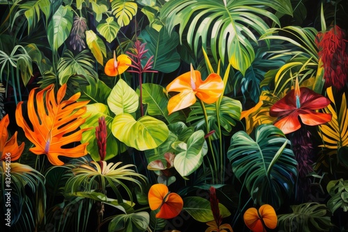 Fototapeta premium A painting featuring lush tropical plants and vibrant flowers, set against a...