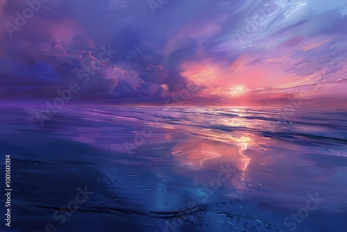 © shobakhul, Fototapeta premium A painting of a beach with a sunset in the background, generative ai image