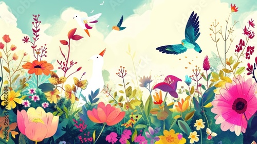 © Olga, Fototapeta premium a painting of a bird flying over a field of flowers with birds flying in the sky in the background and a bird in the foreground with a bird in the foreground.
