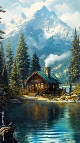 © VISUAL BACKGROUND, Fototapeta premium A painting of a cabin in the mountains by a lake