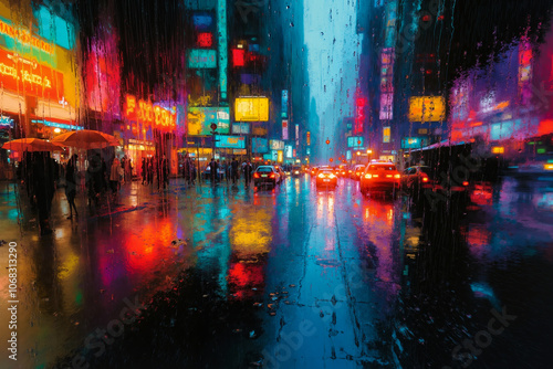 © stanhert, Obraz premium A painting of a city street at night with people walking in the rain