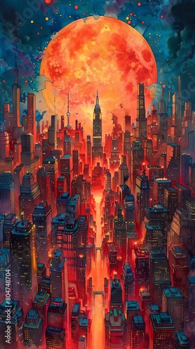 © Sataporn, Obraz premium A painting of a city with a large moon in the background