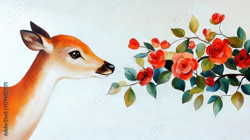 © Anna, Fototapeta premium A painting of a deer smelling a rose-laden branch