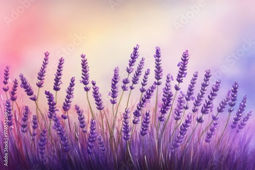 © Thitiphan, Naklejka premium A painting of a field of lavender flowers with a pink and blue background. The mood of the painting is serene and peaceful