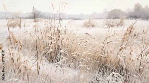 Fototapeta premium a painting of a field of tall grass with snow on the ground in the foreground...