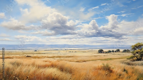 © Anna, Fototapeta premium a painting of a field with trees and clouds in the background. generative ai