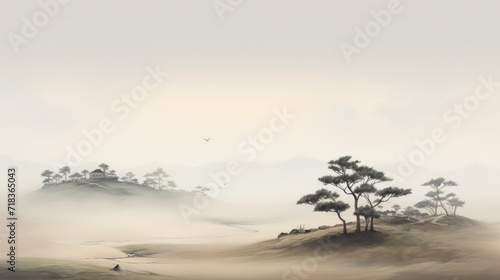 © Anna, Fototapeta premium a painting of a foggy landscape with trees in the foreground and a bird flying over the top of a hill.