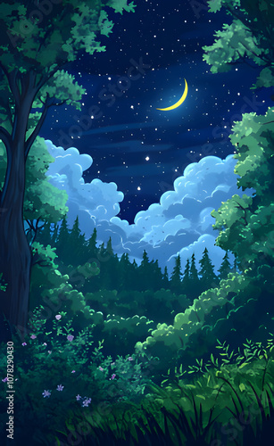 © HUIWON, Fototapeta premium a painting of a forest with a moon and trees in the background. Generative AI