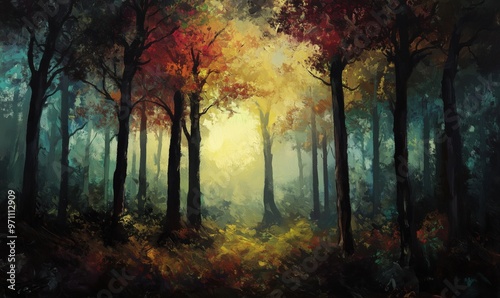 © panumas, Naklejka premium A painting of a forest with trees in various shades of green and brown. The painting has a moody and serene atmosphere, with the trees appearing to be in a state of transition from summer to fall