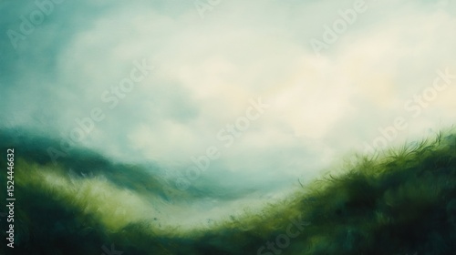 © progressman, Naklejka premium A painting of a grassy hillside with a cloudy sky