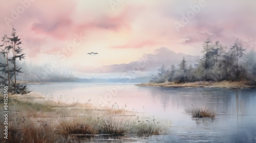 © LOMOSONIC, Fototapeta premium A painting of a lake with a bird flying over it