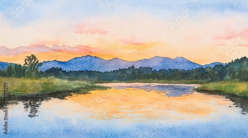 © ศุภมาส, Fototapeta premium A painting of a lake with mountains in the background