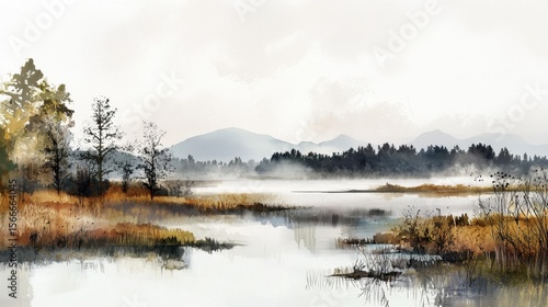 © Babb, Fototapeta premium A painting of a lake with trees in the background