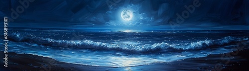 © Natthakan, Obraz premium A painting of a moonlit ocean with a large wave