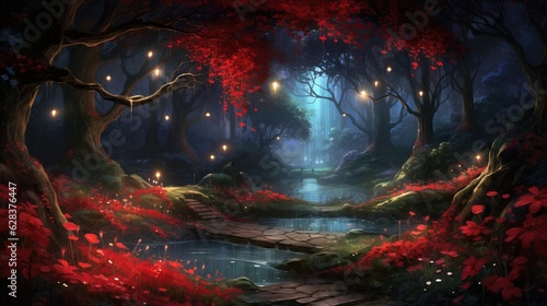 © Anna, Naklejka premium a painting of a path leading to a forest with lights. generative ai