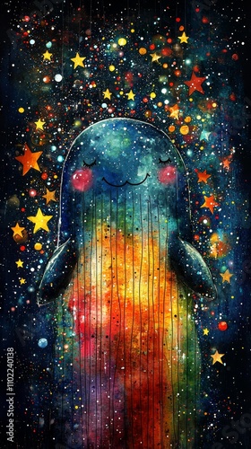 © Albert, Obraz premium a painting of a rainbow-colored whale with stars in the background, set against a black backdrop The whale is surrounded by a multitude of vibrant colors, creating