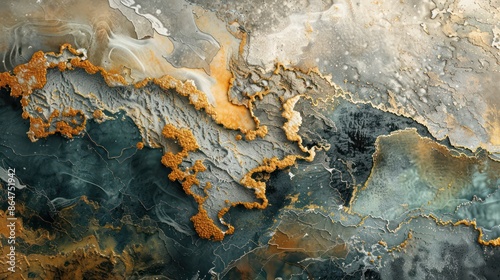 © Charoen, Fototapeta premium A painting of a rocky shoreline with a blue and white background