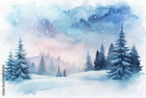 Fototapeta premium A painting of a snowy forest with pine trees and a sky full of stars