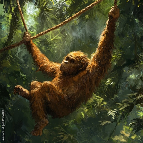 © Mikus, Fototapeta premium A painting of an orangutan hanging from a rope in the jungle