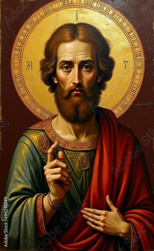 © Space Priest, Naklejka premium A painting of Jesus Christ with a beard and red robe