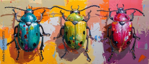 Naklejka premium A painting of three colorful beetles , vibrant color