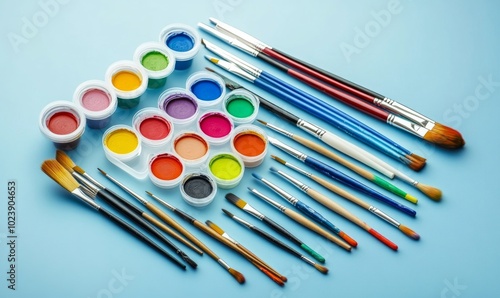 © Александр Михайлюк, Naklejka premium A painting set with a variety of colors and brushes on a blue background