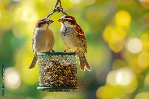 © Fotograf, Naklejka premium A pair of birds perched on a bird feeder, enjoying their meal