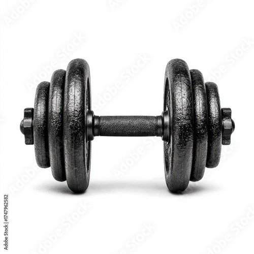 © One Studio, Fototapeta premium A pair of black adjustable dumbbells, centered against a white background. Each end features stacked weighted plates, secured by a black barbell shaft. The shaft is wrapped with a textured grip