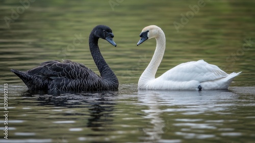 © KYR, Fototapeta premium A pair of black and white swans form a heart shape with their necks on a tranquil lake, reflecting harmony and serenity.