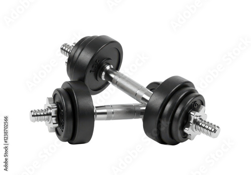 Fototapeta premium A pair of black gym dumbbells with visible weight markings, resting on a white surface, isolated on a white background