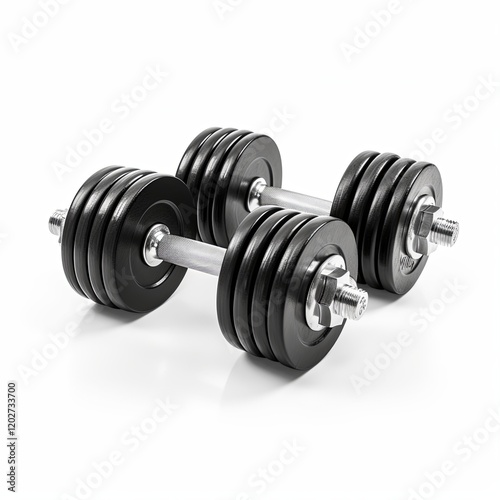 © Irinka Dimkovna, Fototapeta premium A pair of black metal dumbbells isolated on a white background. The dumbbells are made of cast iron and have a knurled grip. The weights are marked with their weight in kilograms.