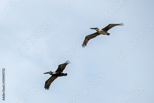 © Daniel, Obraz premium A pair of Brown Pelicans flying in an overcast sky.