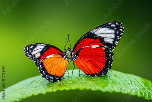 © Sanchai, Fototapeta premium A pair of butterflies mating on a bright green leaf, wings gently touching