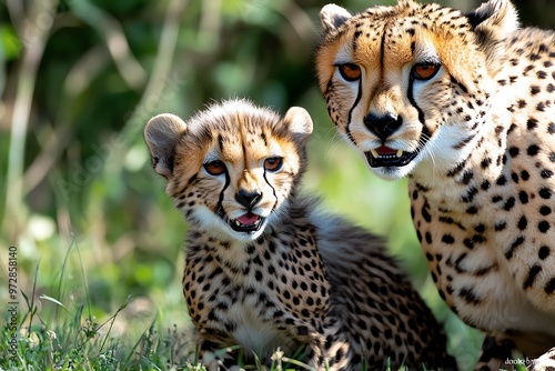 © Sanchai, Obraz premium A pair of cheetah cubs playing in the grass, learning how to hunt by pouncing on each other under the watchful eye of their mother