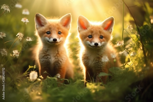 Fototapeta premium : A pair of curious fox kits playing in a sunlit clearing within a dense, enchanting forest