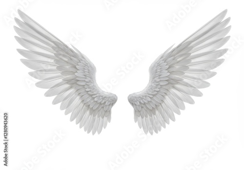Naklejka premium A pair of detailed pure white feathered angel wings, isolated on a white background