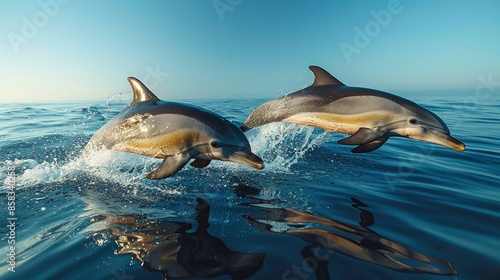© kanesuan, Fototapeta premium A pair of dolphins leaping out of the ocean with a clear blue sky in the background offering space for text