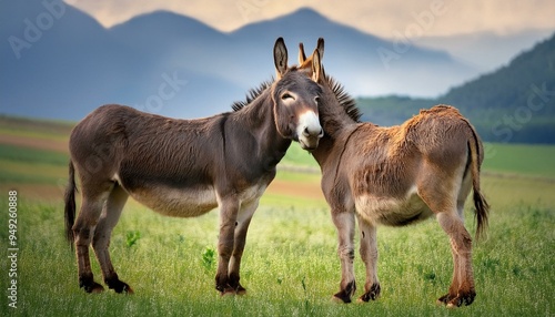 Fototapeta premium A pair of donkeys nuzzling each other affectionately in a green pasture, with a distant moun