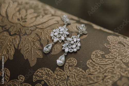 © Vasil, Obraz premium A pair of earrings with a flower design are displayed on a brown cloth. The earrings are made of crystal and have a drop-shaped design. The cloth is a brown color and has a floral pattern