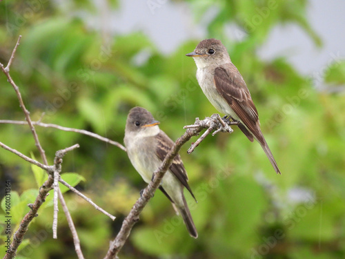 © Scenic Corner, Fototapeta premium A pair of eastern wood-pewees, perched on a branch within the woodlands of the Bombay Hook National Wildlife Refuge, Kent County, Delaware.